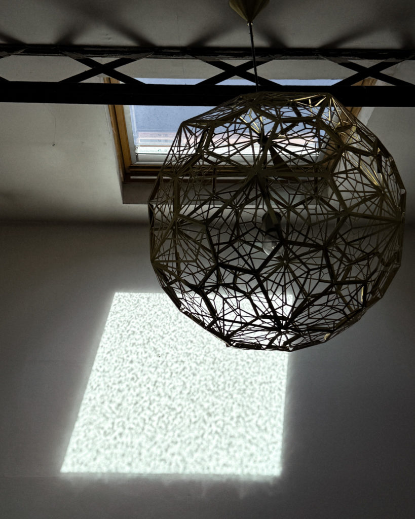 Pendant la sieste du bébé, je lève le regard : le soleil m’offre ce carré de lumière parsemé de l’ombre des gouttes de pluie, tout juste tombées. Une beauté éphémère, un cadeau de la météo capricieuse.